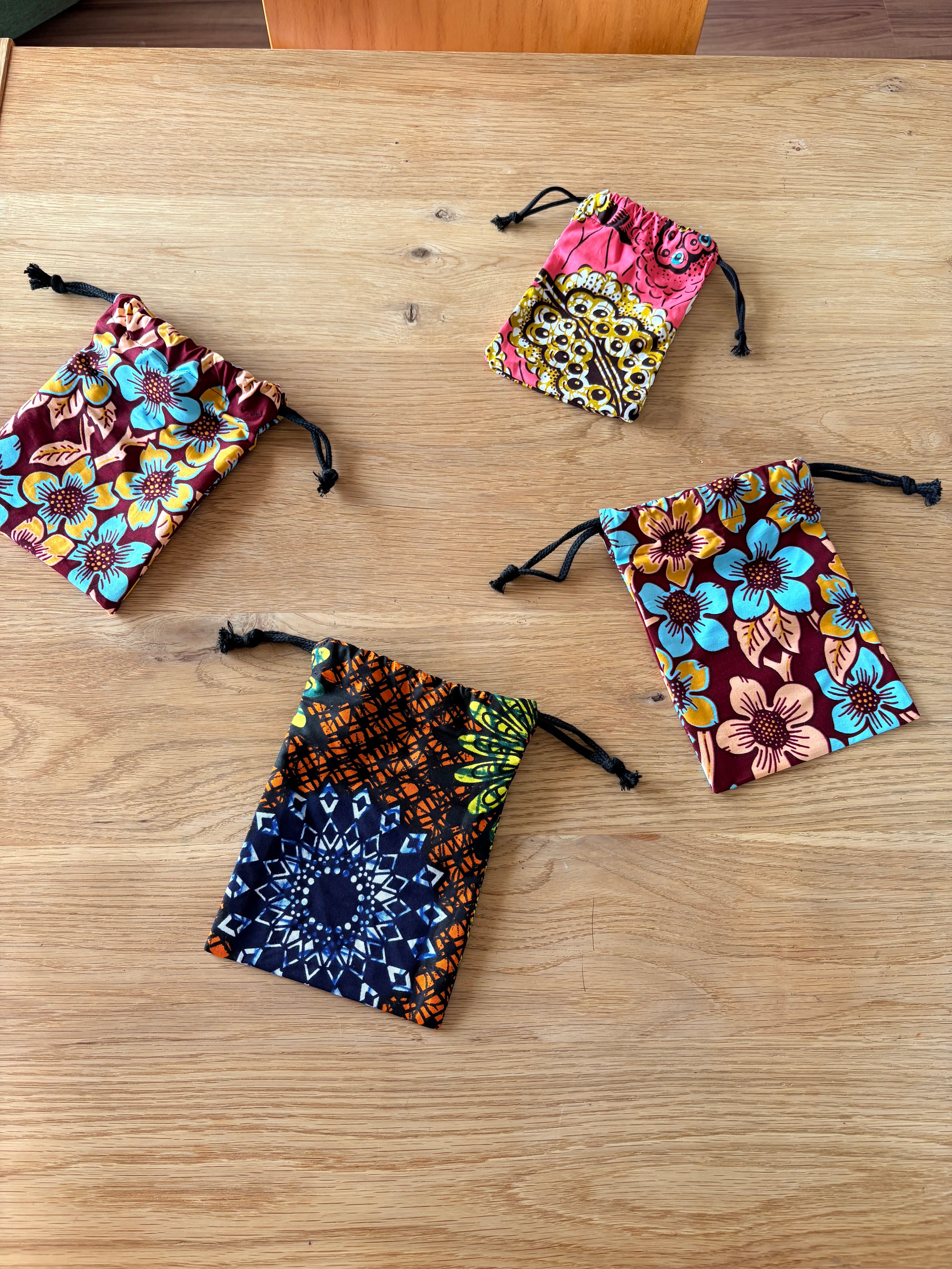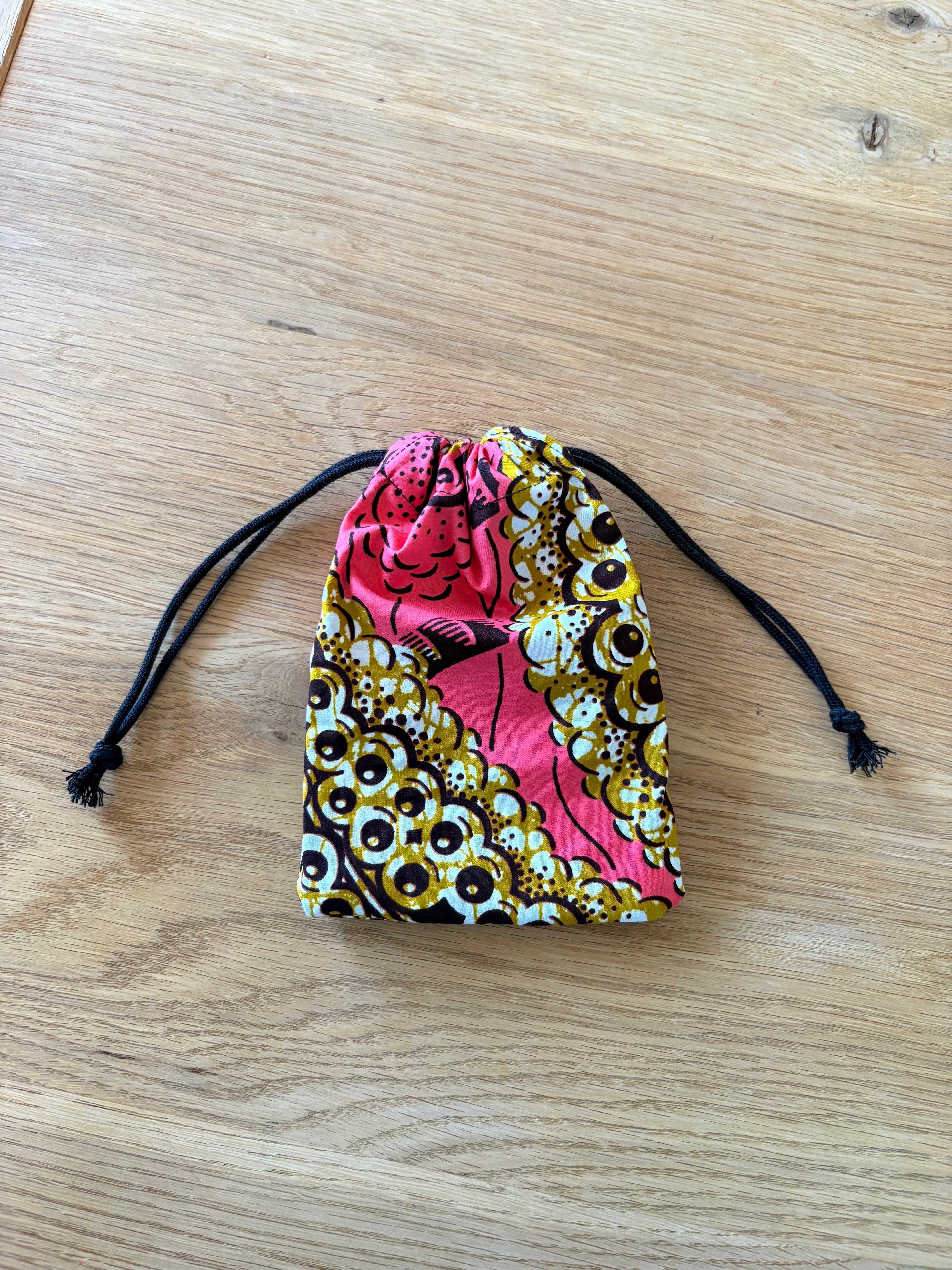 アフリカの布で巾着作りました。ティッシュ、生理用品、リップクリーム、目薬、点鼻薬など必要なものを入れてバックにしのばせて。