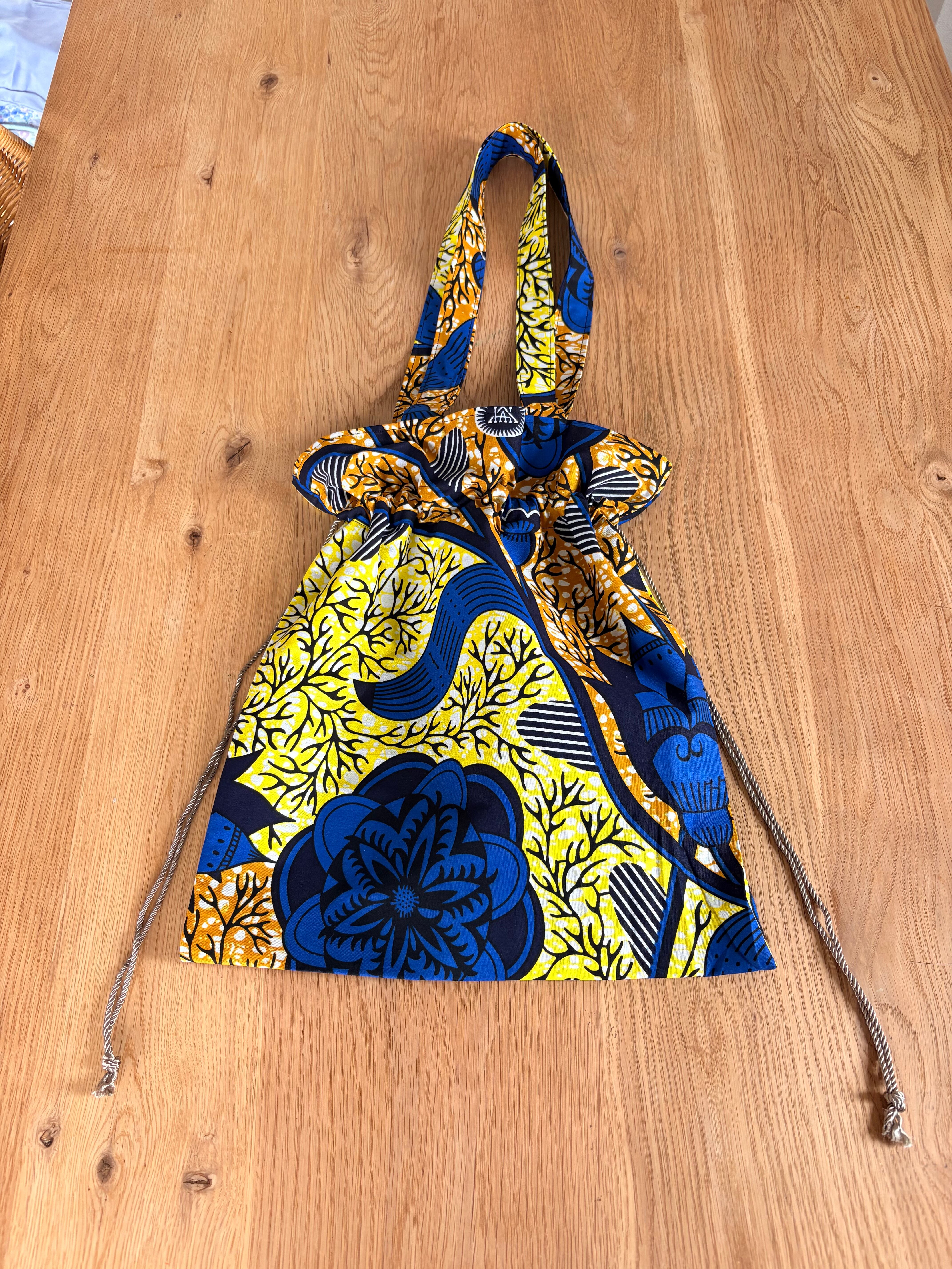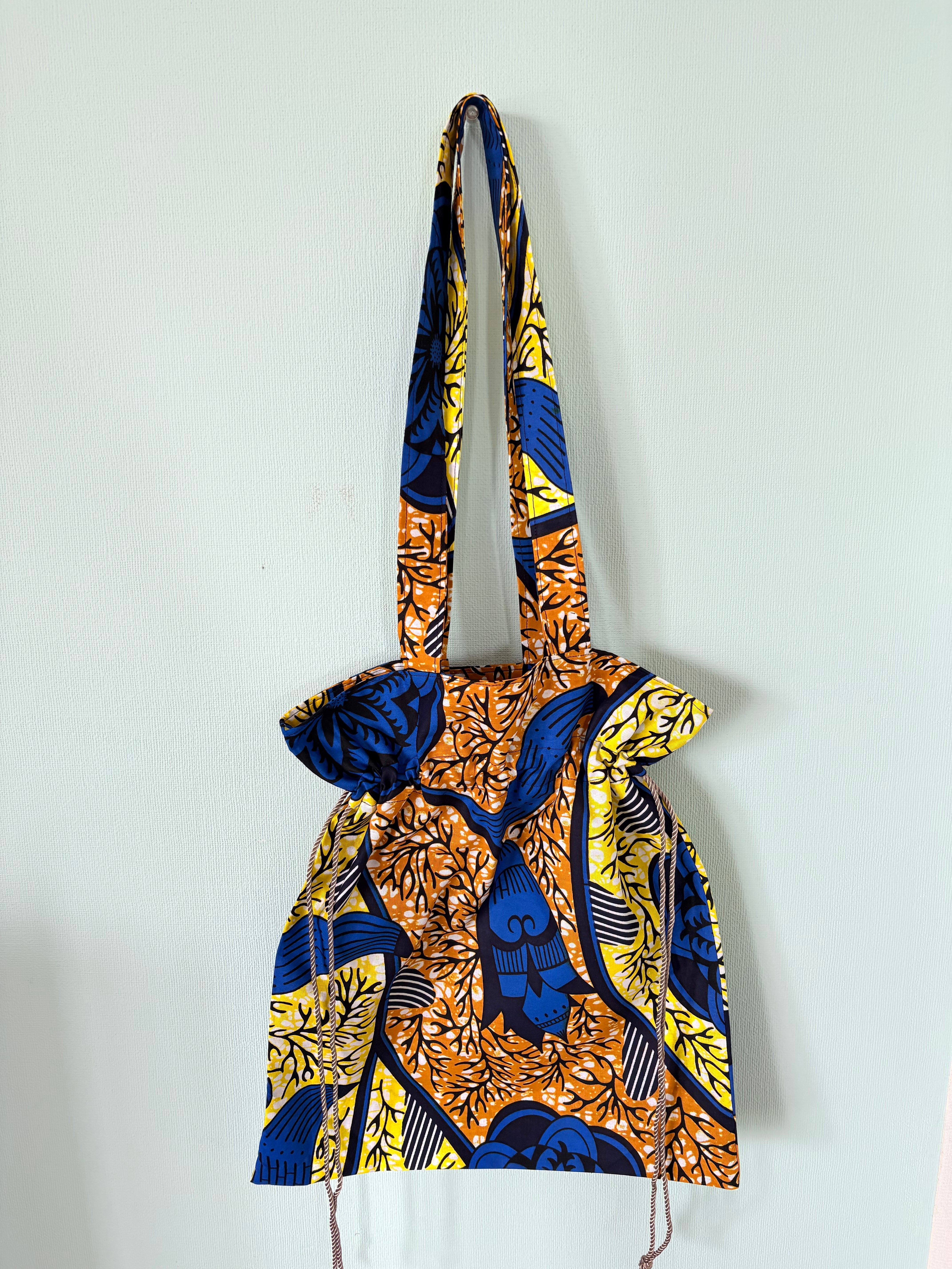 アフリカンファブリックの柄が可愛く、きゅっと紐を絞ると可愛いシルエットになる巾着トートバッグです。