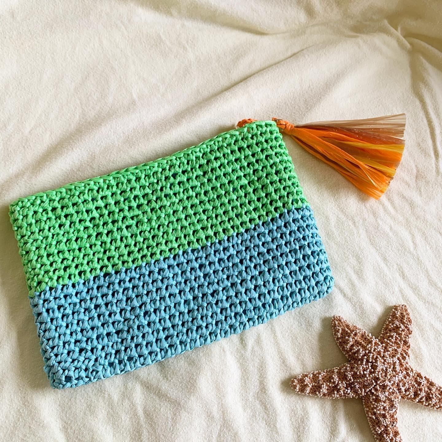 シンプルにミントグリーンとイエローグリーンの糸で編んだ落ち着いた雰囲気のポーチです。