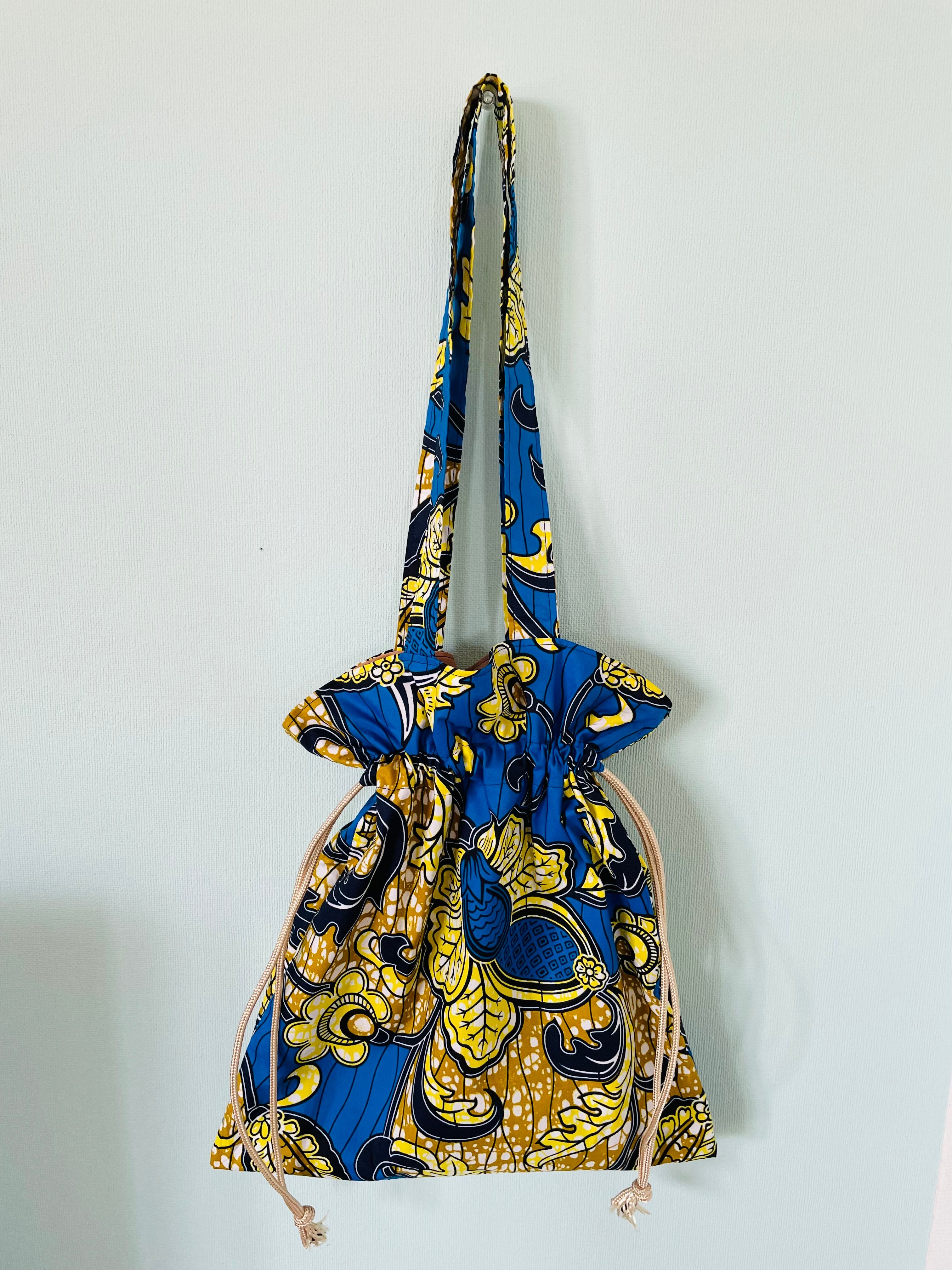 アフリカンファブリックの柄が可愛く、きゅっと紐を絞ると可愛いシルエットになる巾着トートです。