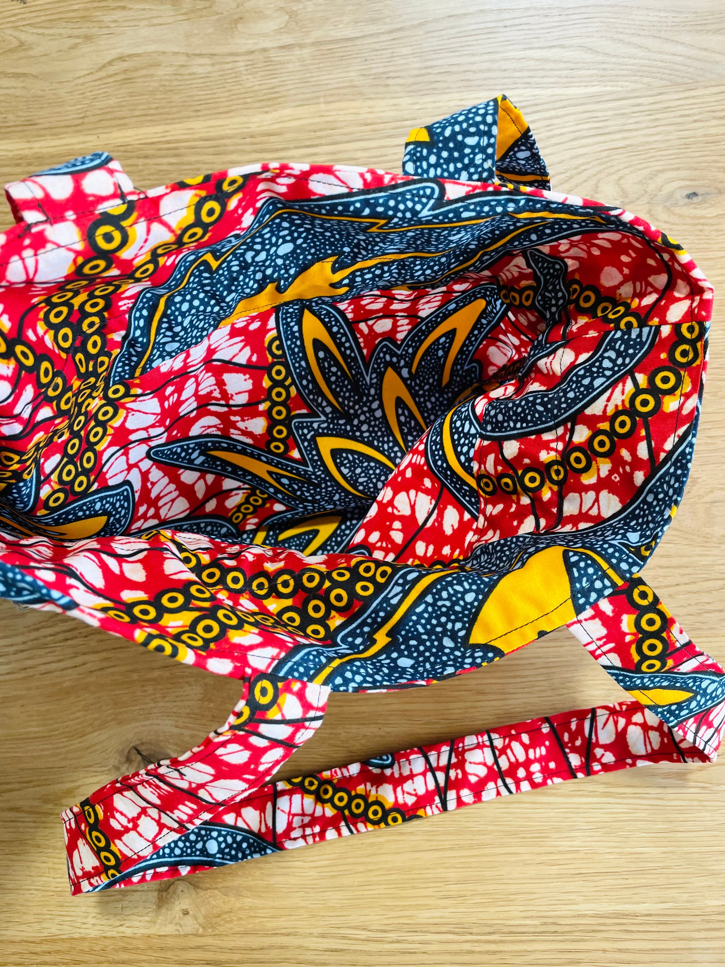 アフリカンファブリックの柄が可愛く、きゅっと紐を絞ると可愛いシルエットになる巾着トートバッグです。